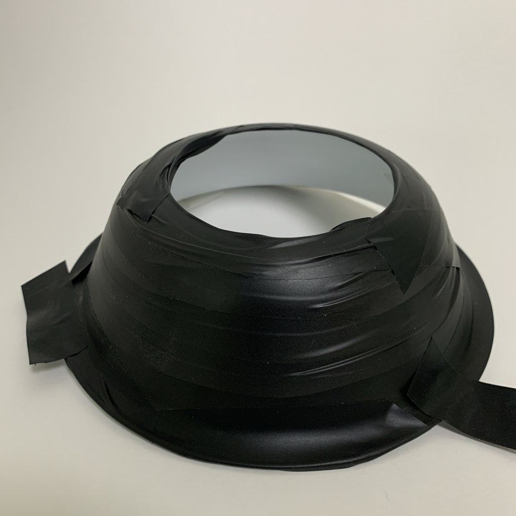 Another change I made to this version was the back of the bowls. On version 1, my mindset was to try to use items that were in my recycling bin as much as I could. This included a thick grey plastic bag that had been used as a postal envelope to cover the back of the white plastic bowls to eliminate light leaks. I thought that the double layer was a bit of an over-kill so I used only one layer. But on the bowl that would be the front of the snoot, I used the black electrical tape that I used to put the straws together into a honeycomb. After shooting, I realized that the black tape blocked out the light, like I wanted, but it was also doing a MUCH better job than the reflecting dish on the back end. So I took off the plastic and taped it, too.
